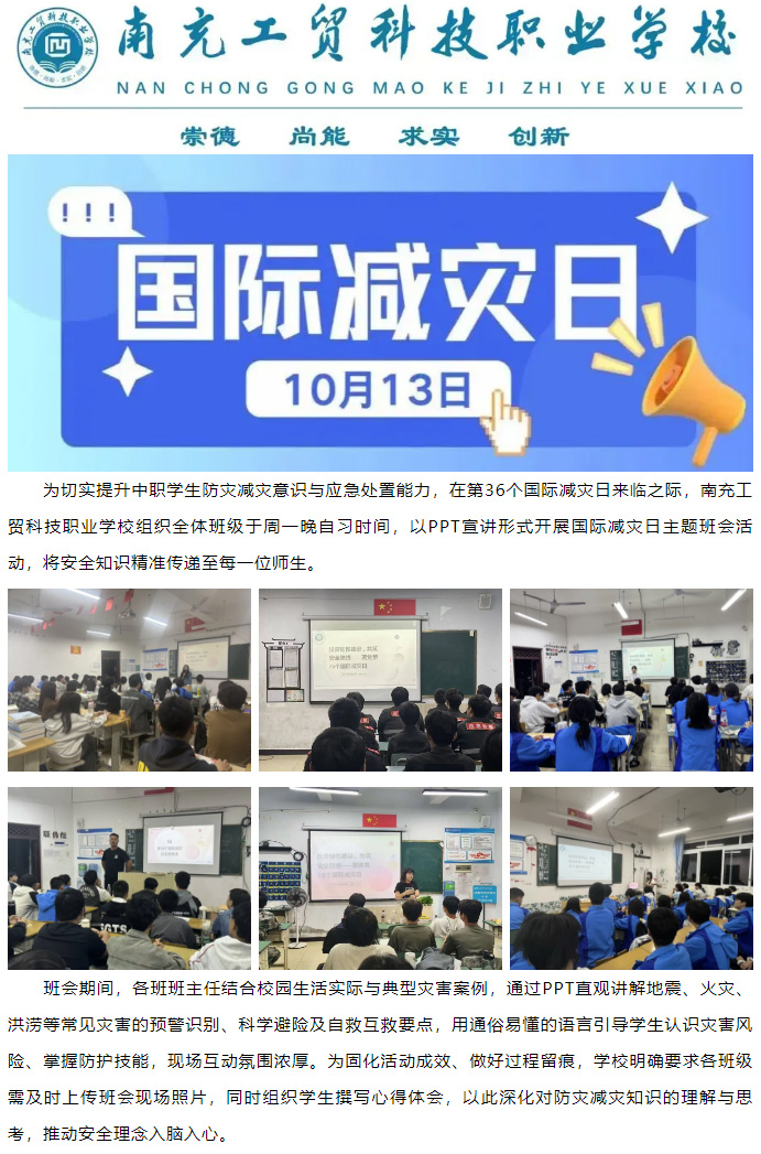 【平安工贸】南充工贸科技职业学校开展国际减灾日主题班会,筑牢校园安全屏障