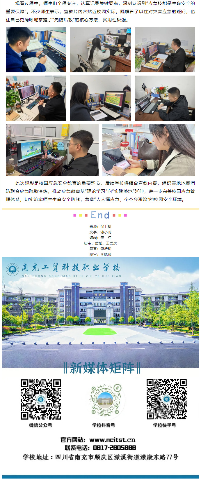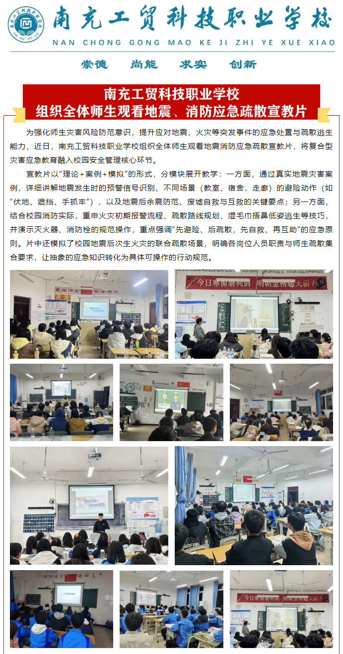【平安工贸】南充工贸科技职业学校组织全体师生观看地震、消防应急疏散宣教片